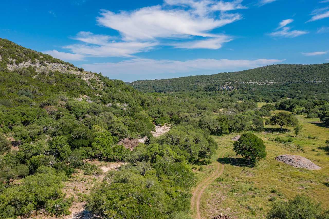 At 437 acres this ranch has over a mile of paved frontage on Hwy 83, and its other boundaries are bracketed by large properties and infamous hill country ridges providing a degree of privacy one might never expect to find so close to town. Shut-in Creek meanders through the interior of the property for well over a mile in route to joining with the Frio River a short distance downstream. This creek which flows in times of regular rain is the centerpiece of the ranch and is lined by enormous centuries old Live-Oaks and numerous other varieties of trees. The ranch is well watered with two shallow wells (one electric and one solar) and one Trinity Aquifer well capable of producing large volumes of water. A lined stock tank is serviced by any of the three wells.