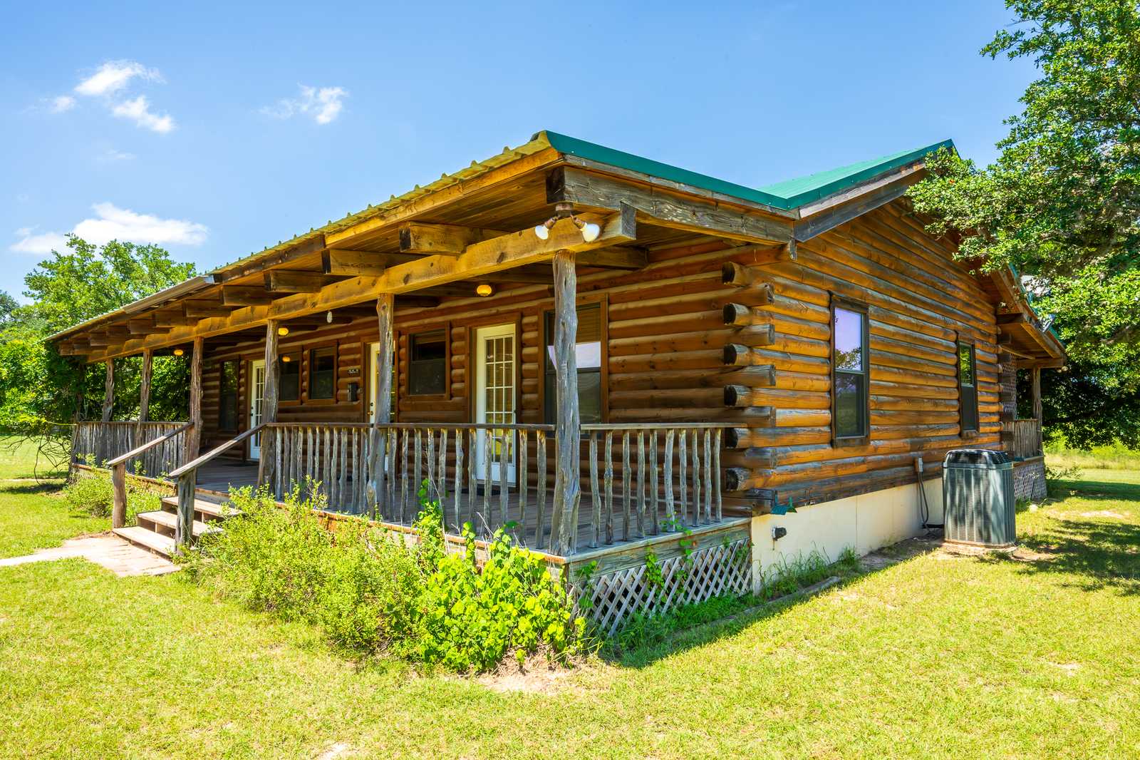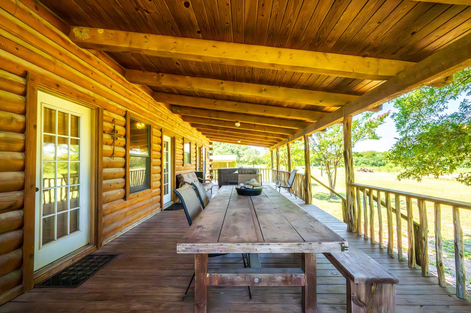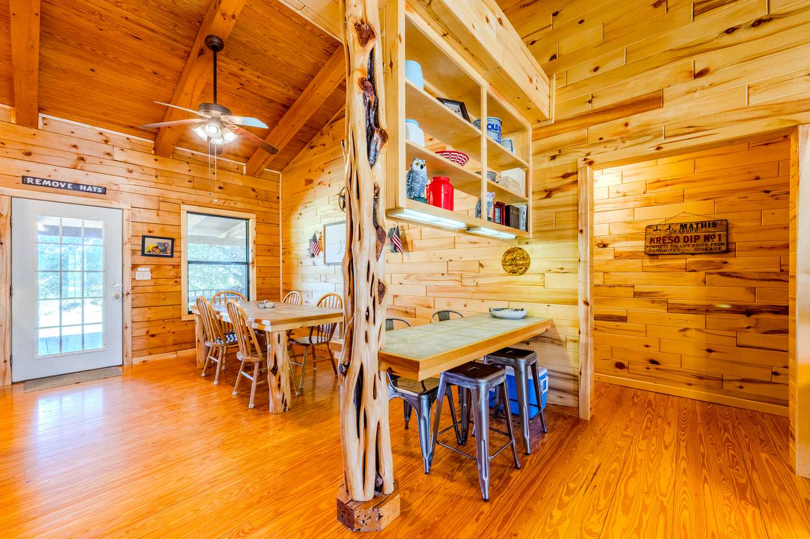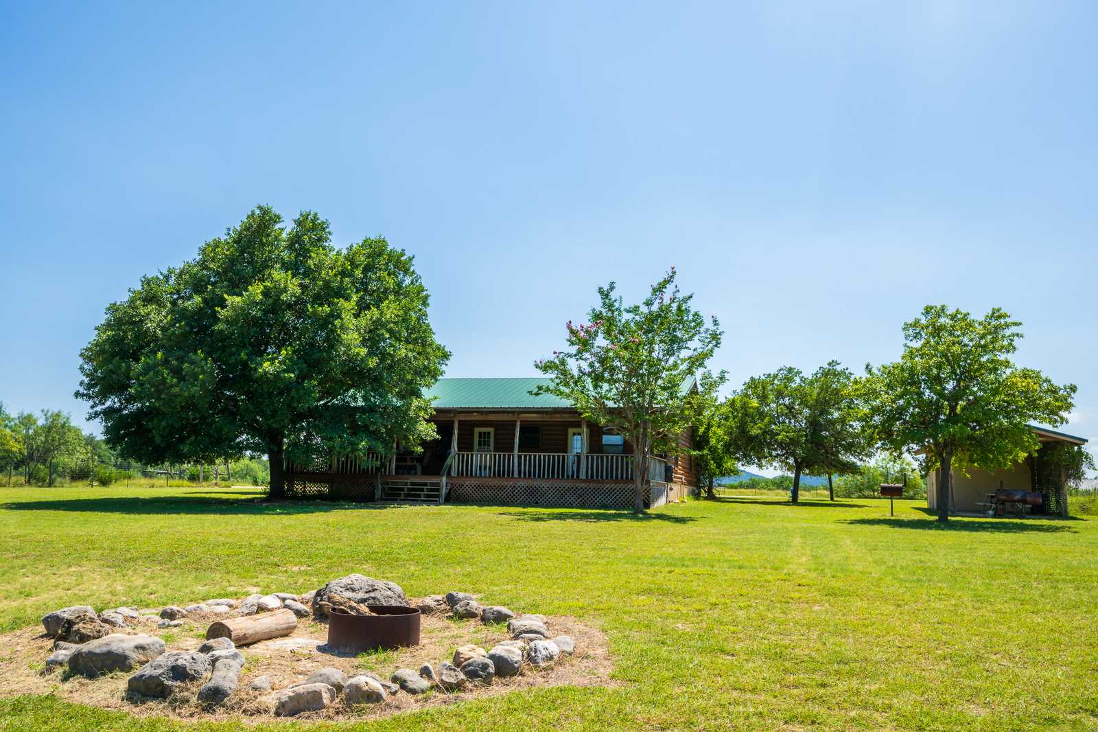 River Park Lodge is located just outside historic Utopia, Texas, with frontage on the Sabinal River. The log cabin home boasts hardwood floors and aspen plank walls. With four bedrooms and two baths, it has just over 1,500 sf of living area along with front and back porches and a hot tub.