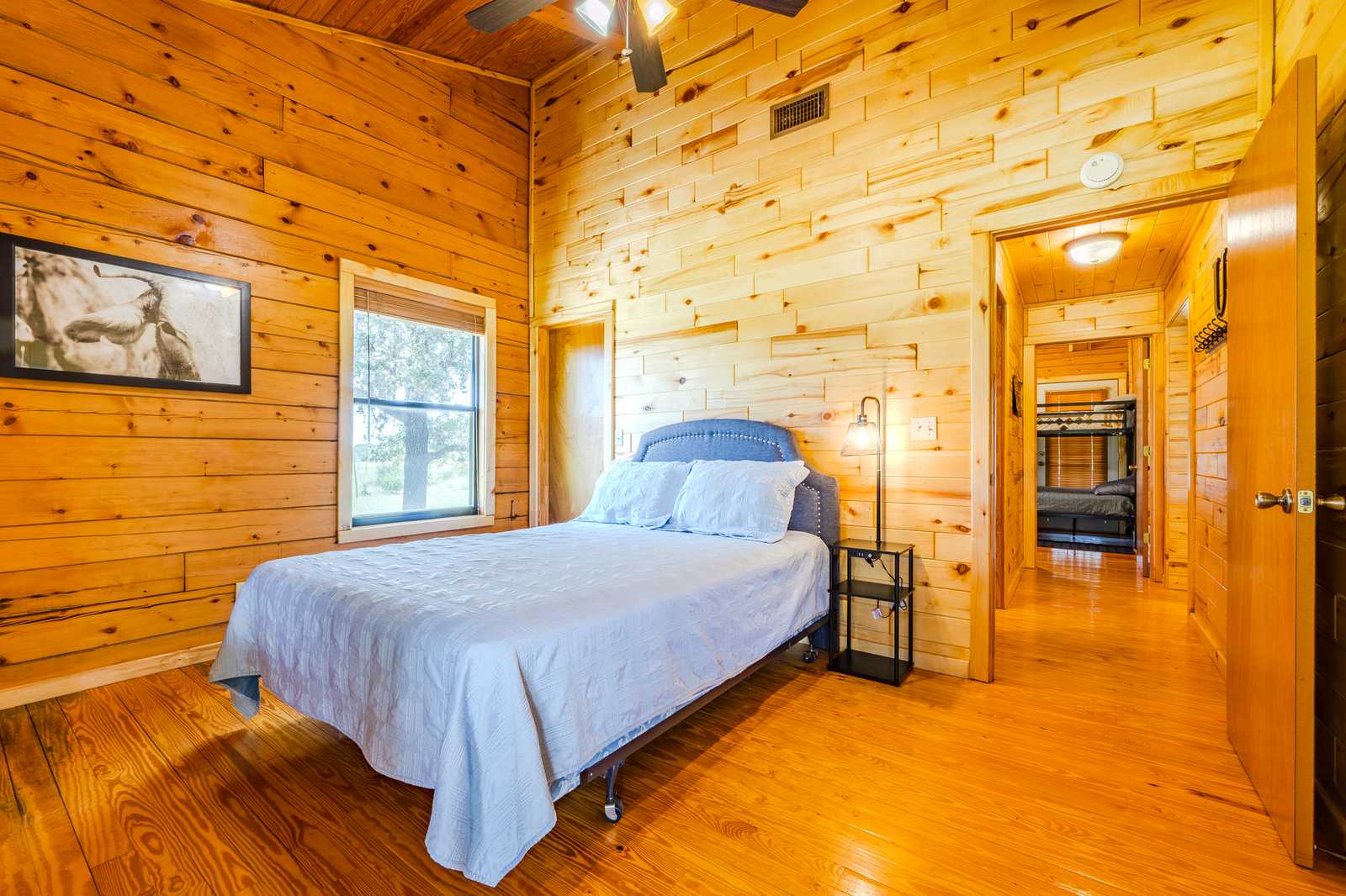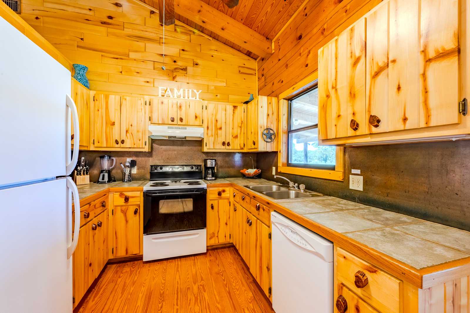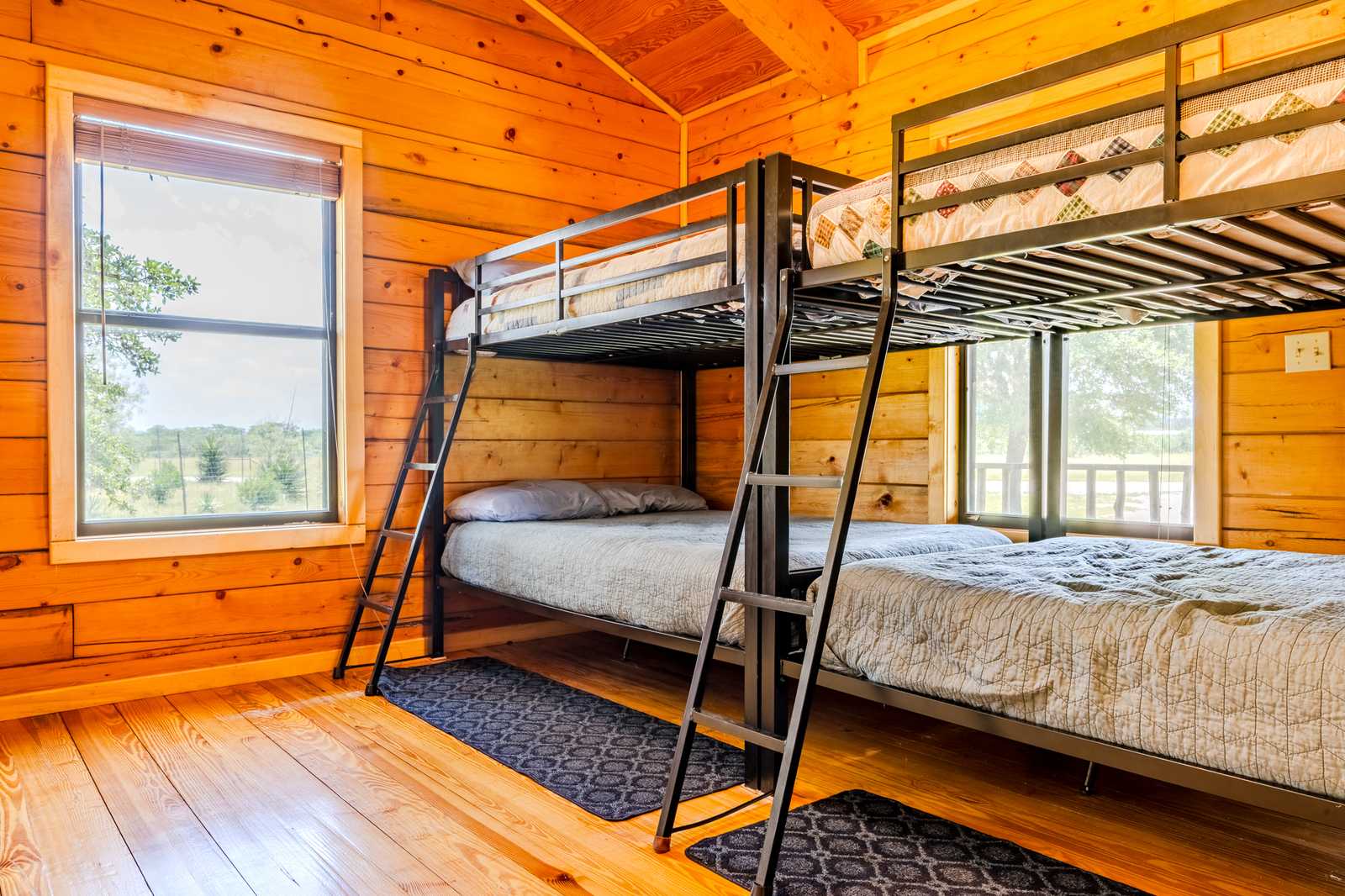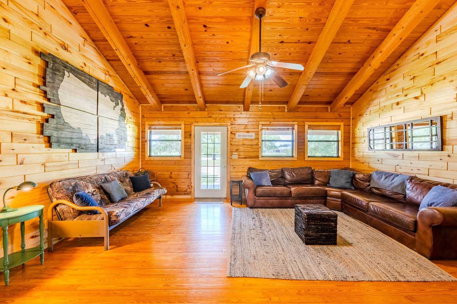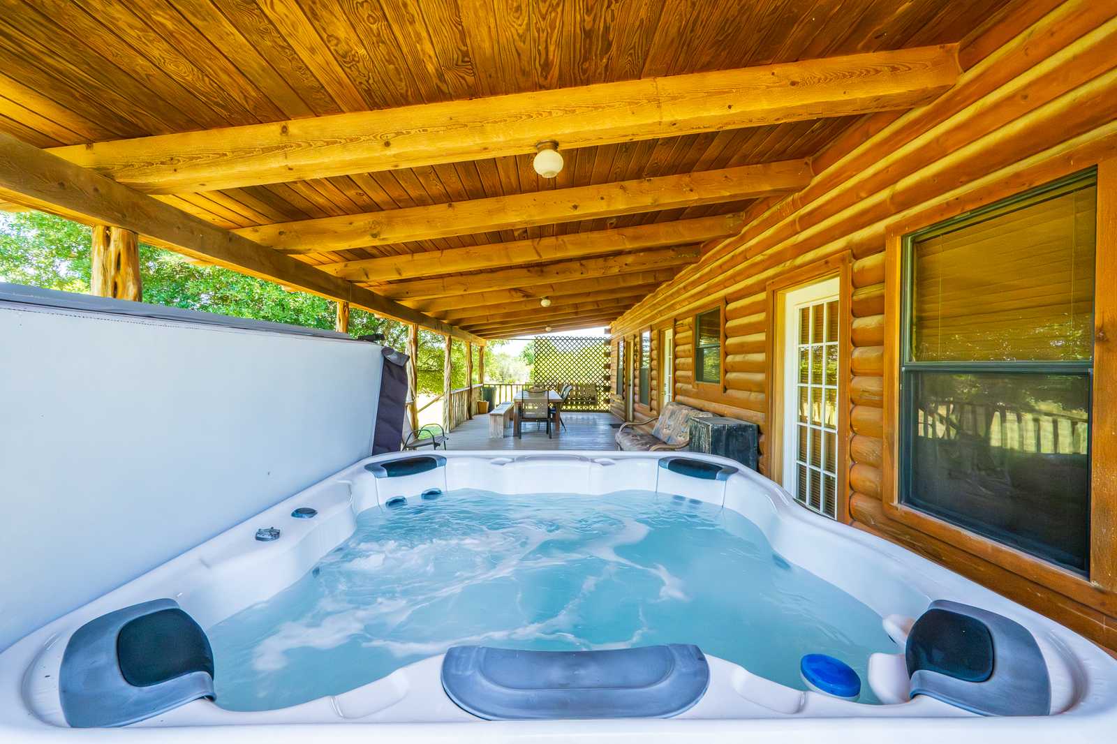 River Park Lodge is located just outside historic Utopia, Texas, with frontage on the Sabinal River. The log cabin home boasts hardwood floors and aspen plank walls. With four bedrooms and two baths, it has just over 1,500 sf of living area along with front and back porches and a hot tub.